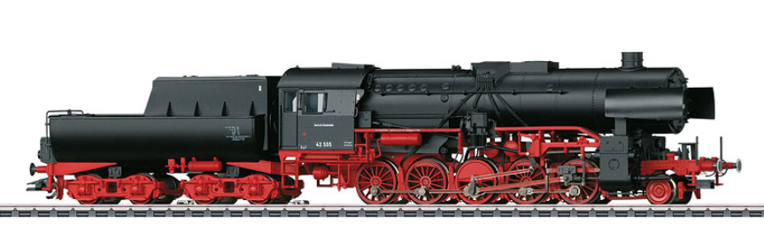 Vorbild: Schwere Güterzug-Dampflokomotive Baureihe 42, mit Wannentender 2´2´T30 der Deutschen Bundesbahn (DB). Schwarz/rote Grundfarbgebung. Mit Witte-Windleitblechen der Regelausführung, Vorlauf-Radsatz mit Vollrädern, beide unteren Stirnlampen vorne an der Lok im Zylinderblock eingebaut. Kein Löscheschutzblech unterhalb der Rauchkammertür. Lok-Betriebsnummer 42 555. Betriebszustand um 1950.