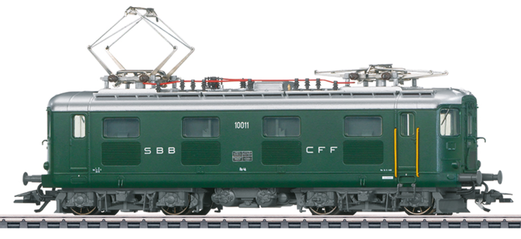 Vorbild: Elektrolokomotive Re 4/4 (spätere Re 4/4 I) der Schweizerischen Bundesbahnen (SBB) aus der ersten Bauserie. Tannengrüne Grundfarbgebung. Ursprungsausführung mit stirnseitigen Übergangstüren und Übergangsblechen. Lok-Betriebsnummer 10011. Betriebszustand um 1959.