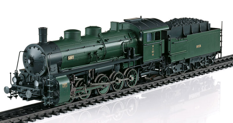Vorbild: Schwere Güterzug-Dampflokomotive der bayerischen Gattung G 5/5, mit Schlepptender 2´2 T21,8. Bauart-Ausführung aus der dritten Lieferserie. Dunkelgrüne Grundfarbgebung der Gruppenverwaltung Bayern der Deutschen Reichsbahn. Betriebsnummer 5861. Betriebszustand um 1923.