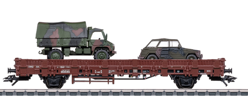 Modell: Rungen abnehmbar. Beladen mit einem Modell des Kübelwagens VW 181 und einem Modell des Unimog S 404 Pritsche/Plane der Deutschen Bundeswehr. Fahrzeughalterungen und einsteckbare Rungen liegen bei. Militärfahrzeug weitgehend aus Metall. Kennzeichen beschriftet. Diverse Ansteckteile aus Kunststoff beiliegend. Modelle der Militärfahrzeuge von Schuco. Länge über Puffer ca. 15,7 cm. Gleichstromradsatz E700580.