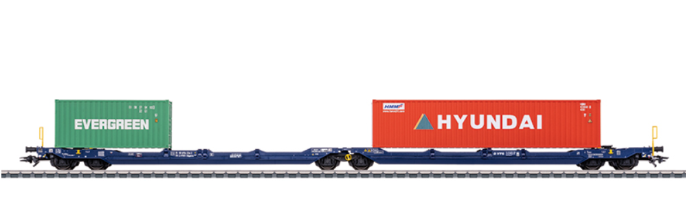 Modell: Beide Tragwagenhälften aus Metall, beweglich gelagert auf dem mittleren Drehgestell. Seitliche Klappriegel ab Werk montiert. Hochklappbar für den Transport von Containern oder Wechselbrücken. Viele separat angesetzte Details wie Tritte, Bremsleitungen und Haltestangen an den Wagenenden. Drehgestelle Bauart Y25. Pufferhöhe nach NEM. Halterungen für Königszapfen in hoher und niedriger Ausführung und Luftkessel für die Wagenenden liegen als separat ansteckbare Teile bei. Beladen mit je einem 20ft. und 40ft. Boxcontainer unterschiedlicher Firmen. Länge über Puffer 39,3 cm.