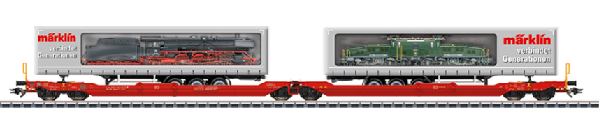Modell: Beide Tragwagenhälften aus Metall, beweglich gelagert auf dem mittleren Drehgestell. Seitliche Klappriegel ab Werk montiert. Hochklappbar für den Transport von Containern oder Wechselbrücken. Viele separat angesetzte Details wie Übergangsrost, Tritte, Bremsleitungen und Haltestangen an den Wagenenden. Drehgestelle Bauart Y25. Pufferhöhe nach NEM. Halterungen für Königszapfen in hoher und niedriger Ausführung, Rangiertritte und Luftkessel für die Wagenenden liegen als separat ansteckbare Teile bei. Beladen mit zwei Gardinenplanen-Sattelaufliegern, die im Märklin Werksverkehr eingesetzt werden. Länge über Puffer ca. 39,3 cm.