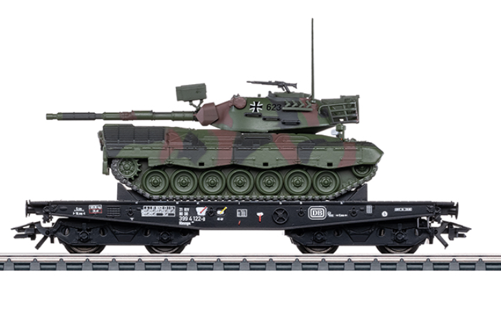 Modell: Rahmen des Schwerlastwagens aus Metall. Ladehalterungen liegen bei. Modell des Leopard 1A1 weitgehend aus Metall. Ketteneinheiten und weitere angesetzte Komponenten aus detaillierten Kunststoffteilen. Turm und Waffe beweglich. Tarnlackierung. Kennzeichen beschriftet. Modell des Militärfahrzeugs von Schuco. Länge über Puffer ca. 12,4 cm.