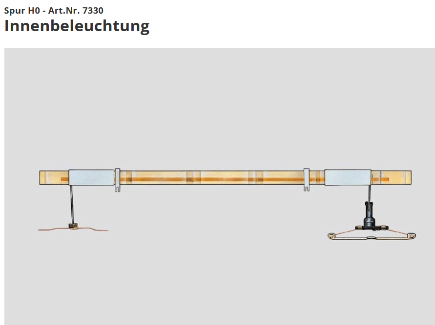 Passend zu den Wagen 42168, 42171, 4227, 4255-4257, 42551-42571, 4264, 4265, 4282, 4285, 4286, 4327, 4368, 4369 und 4384. Bestehend aus Stromzuführung, Leuchtstab mit Lampenfassungen und 2 Glühlampen. Verwendbar mit der Strom führenden Kupplung 7319.