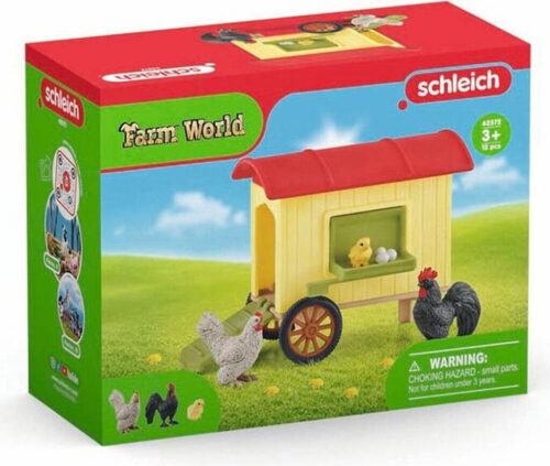 1x Mobiler Hühnerstall mit seitlicher Klapptüre, aufklappbarer Rampe und Brutklappe, 1x Hahn, 1x Huhn, 1x Küken, 1x Eier